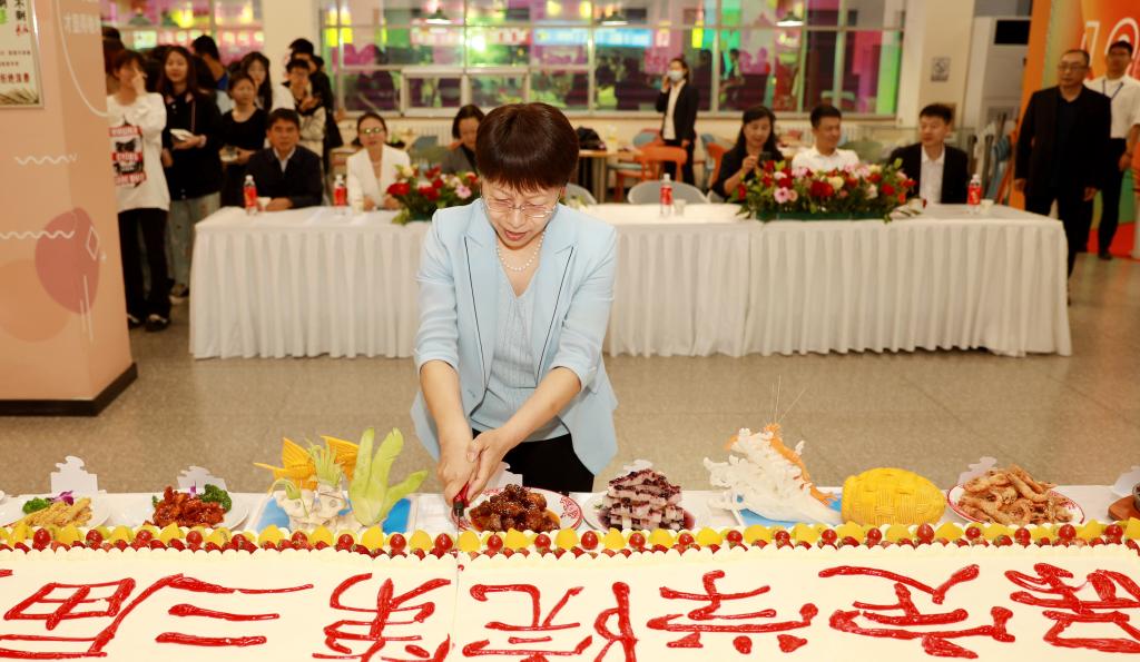 在活动开幕式上,党委副书记、校长韩会玲为师生们分切美食节主题蛋糕。