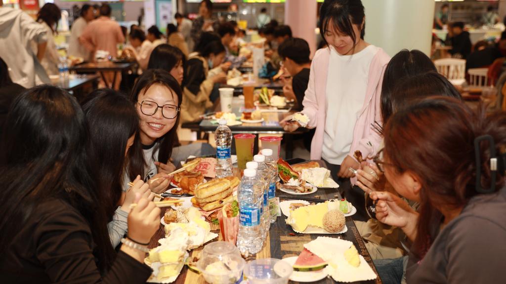 在摆放着各式各样美食的展示区,学生们尽情品尝、拍照打卡,尽享美好校园“食”光,体味有趣有爱、多姿多彩的校园文化生活。