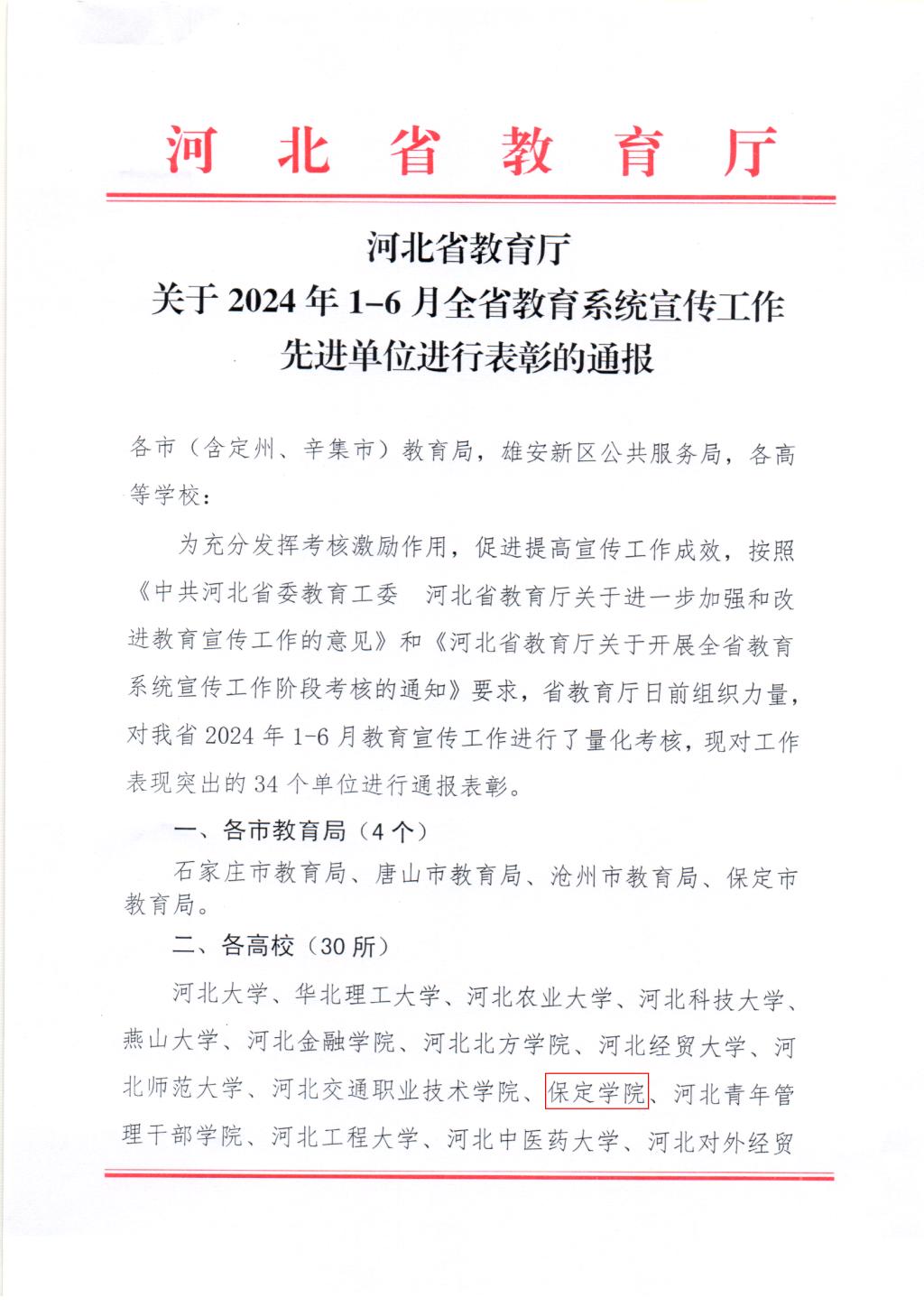8月6日,河北省教育厅发布通报,表彰全省2024年1-6月教育宣传工作表现突出的单位,我校获评“全省教育系统宣传工作先进单位”。
