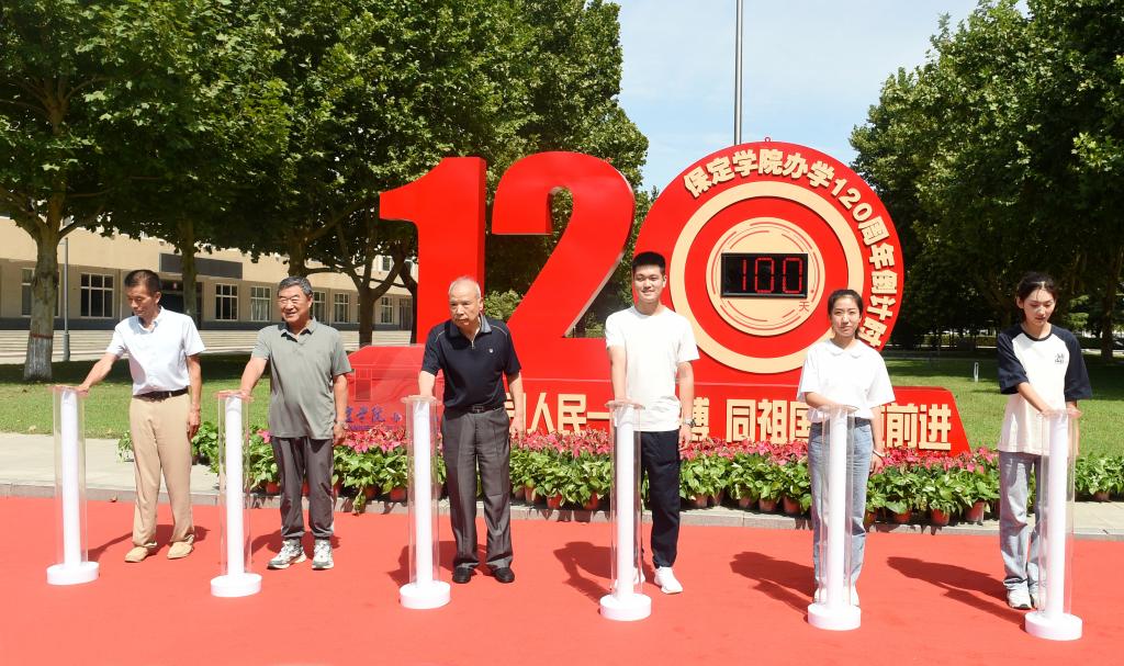 仪式上,1964届校友齐长立、1968届校友高国华、1981届校友宁双哲,在校生代表许家贤、王雨欣、李康悦按下按钮,共同启动保定学院办学120周年倒计时100天装置。