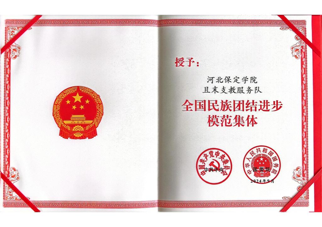 9月27日,全国民族团结进步表彰大会在北京举行。352个全国民族团结进步模范集体和368名全国民族团结进步模范个人受到表彰。保定学院且末支教服务队荣膺全国民族团结进步模范集体。在党和国家历史上,这是第一次以党中央、国务院名义开展这一表彰。