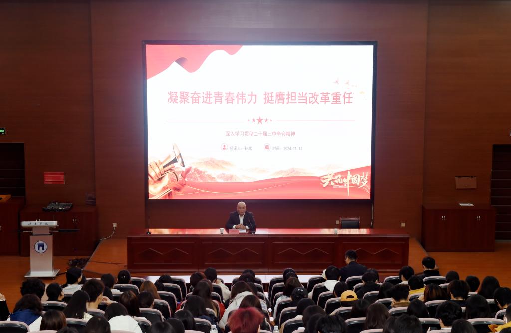 11月13日,党委常委、副校长孙斌在昌绪学术厅以《凝聚奋进青春伟力 挺膺担当改革重任》为题,为外语教育与国际商务学院、汽车与电子工程学院学生讲授思政课。