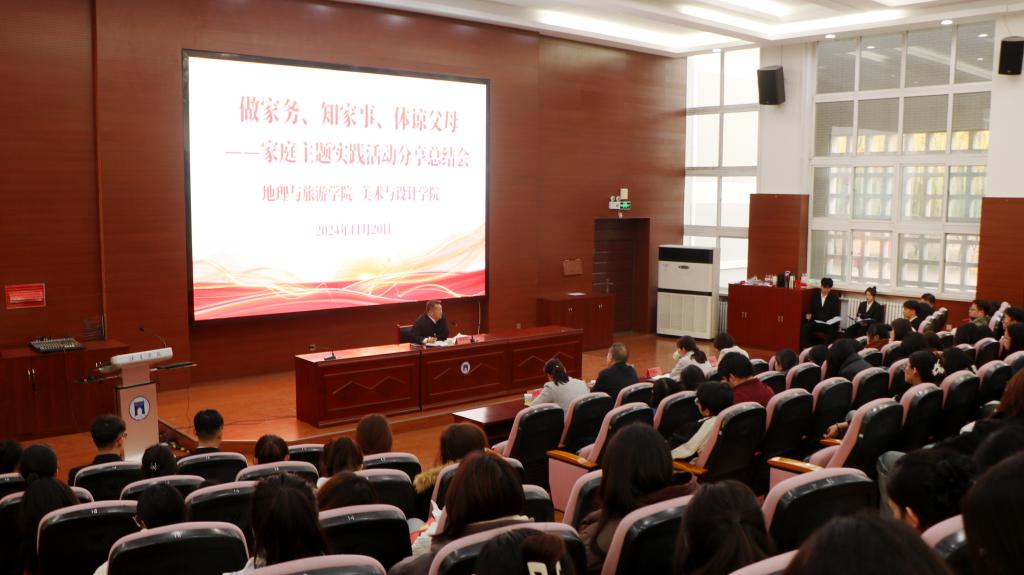 11月20日,地理与旅游学院、美术与设计学院在昌绪学术厅联合举办2024年“做家务 知家事 体谅父母”家庭主题实践活动分享会。党委常委、副校长赵其国参加会议,并对同学们通过参与活动提高了劳动意识、增长了实践才干、培养了家国情怀给予充分肯定。他指出,“听爷爷讲家史”活动从时间维度帮助同学们增强历史观,“做家务 知家事”活动从空间维度引导同学们坚定大局观。家庭主题实践活动对青年学生理想信念教育具有深远意义,要持续设计开展,引导学生坚持学历史、强本领、修德行,传承弘扬中华优秀传统文化,重视家庭家风家教。要力行所知、知行合一,自觉将个人选择与时代发展紧密联系,永葆“绝知此事要躬行”的实干精神,找准角色定位,争做有理想、敢担当、能吃苦、肯奋斗的新时代好青年。