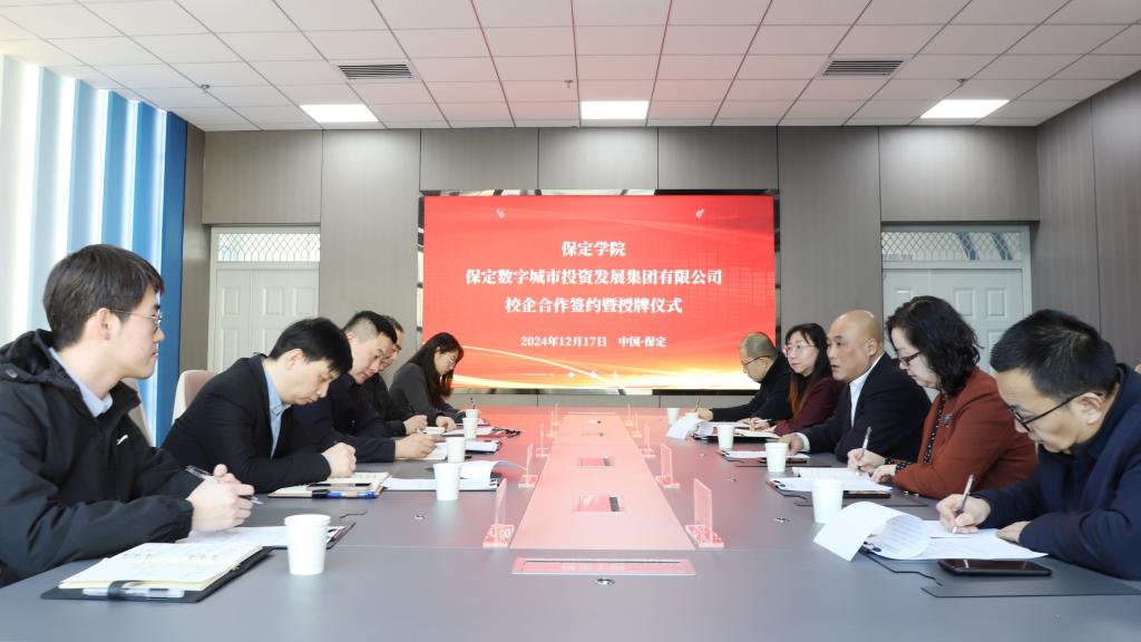 12月17日上午,保定学院与保定数字城市投资发展集团有限公司合作签约暨授牌仪式在人工智能产业学院举行。保定数字城市投资发展集团总经理王家琳,党委委员、副总经理杨磊、郑伟,战略投资部专员,我校党委常委、副校长孙斌,教务处、人工智能学院负责同志和教师代表参加仪式。