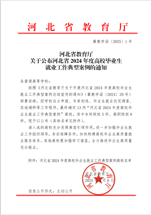 近日,河北省教育厅公布了全省2024年度高校毕业生就业工作典型案例评选结果,我校申报的《践行习近平总书记回信精神,引导毕业生到西部、到基层建功立业》就业工作案例成功入选,我校获评“河北省2024年度高校毕业生就业工作典型案例”高校。
