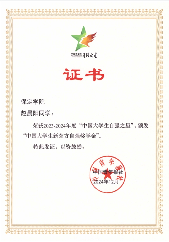 近日,由共青团中央、中华全国学生联合会指导,中国青年报社、新东方教育科技集团、中国青年创业就业基金会联合开展的“中国大学生自强之星”奖学金推报活动结果公布,我校学生赵晨阳获评2023-2024年度“中国大学生自强之星”称号,荣获“中国大学生新东方自强奖学金”。
