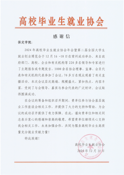 日前,高校毕业生就业协会发来感谢信,对我校对2024年高校毕业生就业协会年会暨第二届全国大学生就业创业博览会的相关工作提供的有力保障表示衷心感谢。
