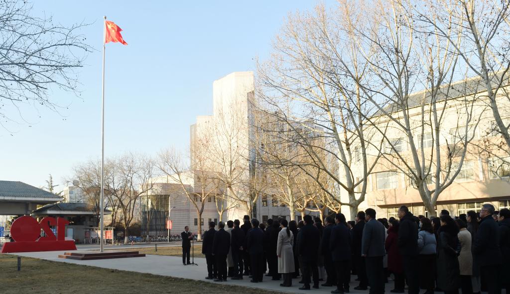 伴随着激昂雄壮的国歌声,鲜艳的五星红旗在晨光中冉冉升起,迎风飘扬。参加仪式的全体人员庄严肃立,满怀深情向国旗行注目礼。