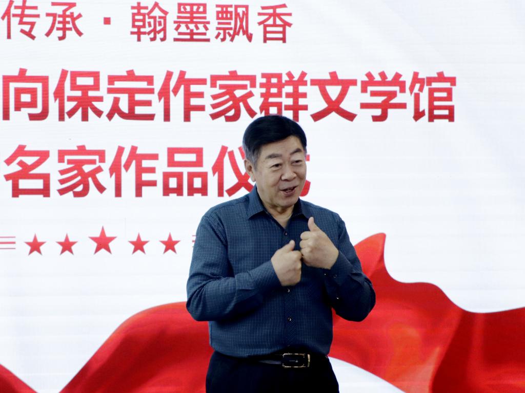 仪式上,著名诗人、朗诵艺术家刘力将珍藏的7件名家字画和11部签名版现当代文学经典图书捐赠给保定作家群文学馆。