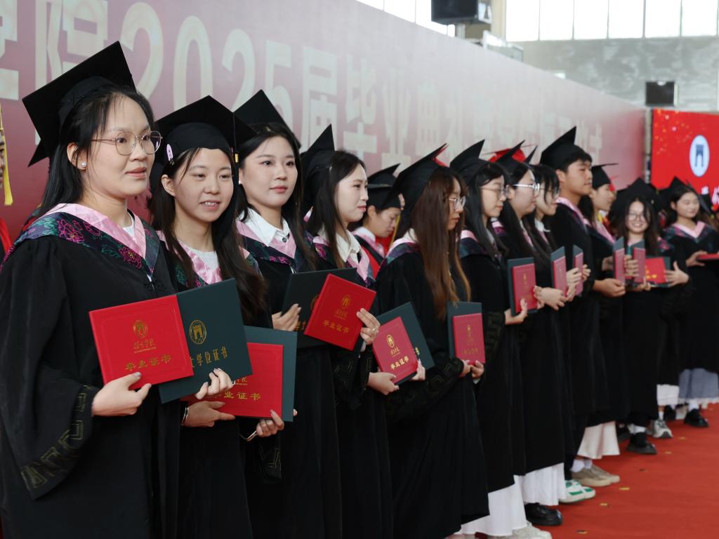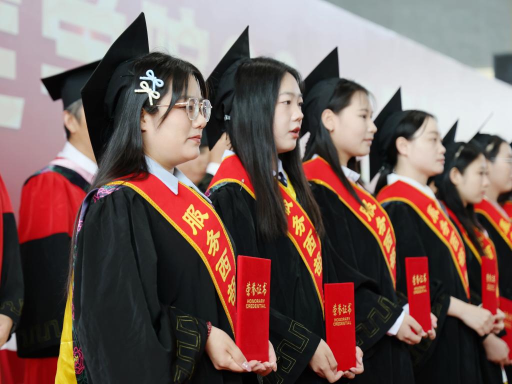 随后,毕业生依次走上主席台,校领导和学位评定委员会委员为他们一一正冠拨穗、授予学位,并向优秀毕业生代表、西部就业毕业生颁发荣誉证书。