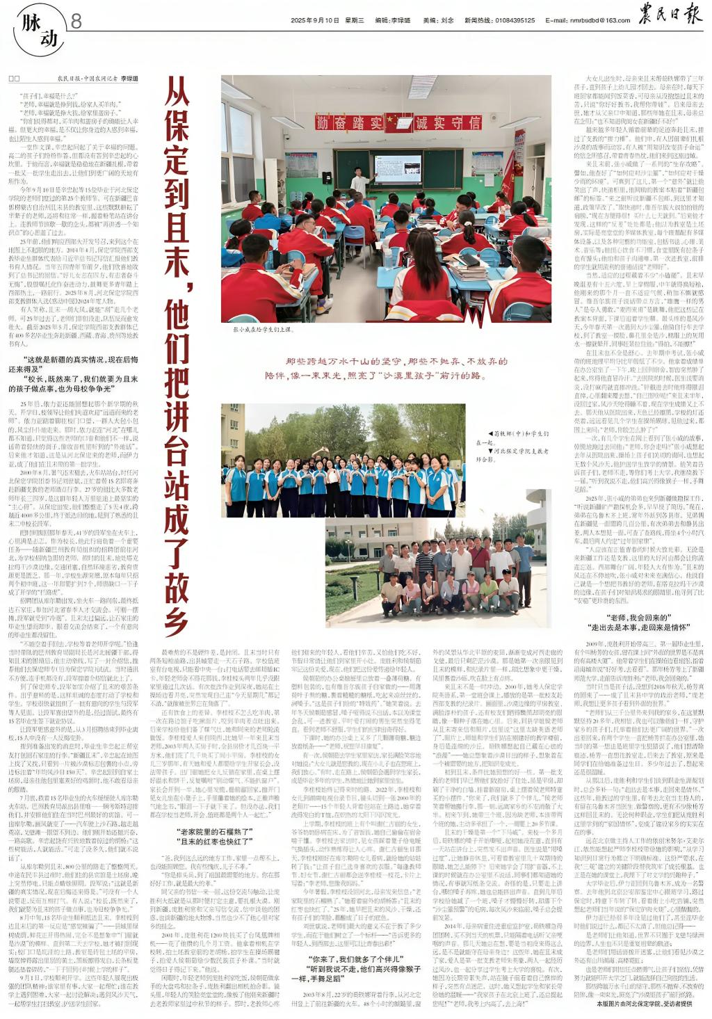 文字,始终蕴藏一种难以言喻却无比强大的力量。《农民日报》在9月10日第8版整版刊发重磅专题报道《从保定到且末,他们把讲台站成了故乡》,以7000字的深情笔墨记录了一代代保定学院学子跨越山河的奔赴和教书育人的坚守。