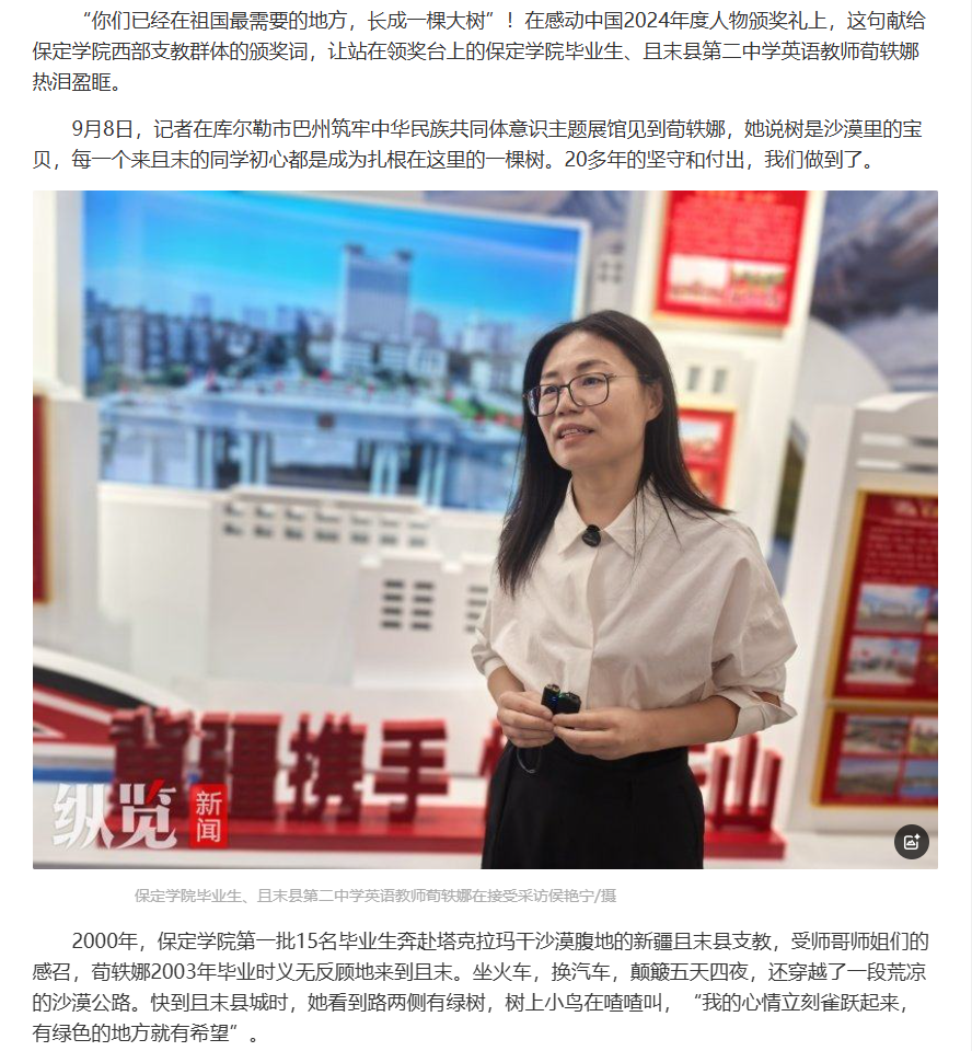 9月9日,河北日报客户端刊发专题报道《保定学院毕业生荀轶娜:“长大后我就成了你”是教育最美的模样》,用细致的笔触展现了荀轶娜和同学们在新疆且末教书育人的付出与收获。在感动中国2024年度人物颁奖典礼上,致保定学院西部支教群体的颁奖词——“你们已经在祖国最需要的地方,长成一棵大树”,再次让读者热泪盈眶。