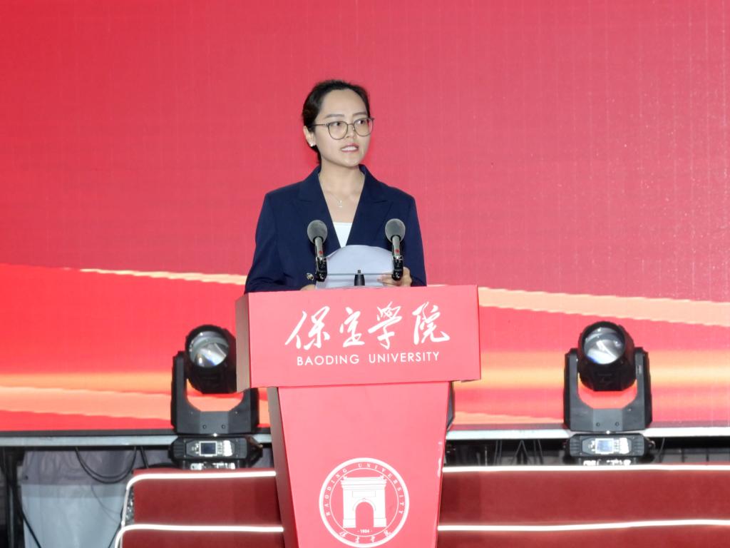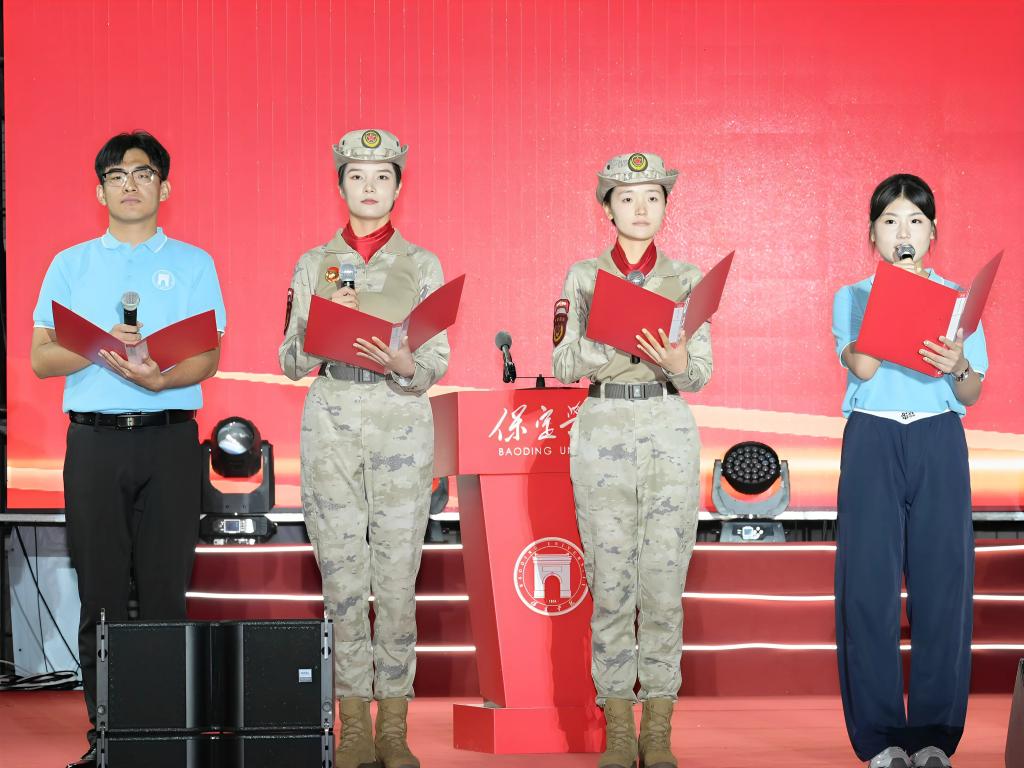 在校生与新生代表:2025级文学院刘英卓、2024级信息工程学院梁欣瑶、2023级教师教育学院张思达、2022级体育学院马寅杰从参加九三阅兵的收获、对红色精神的传承等方面表达了在保定学院这片沃土上锤炼过硬本领、夯实成长底气、担当青春使命的坚定决心。