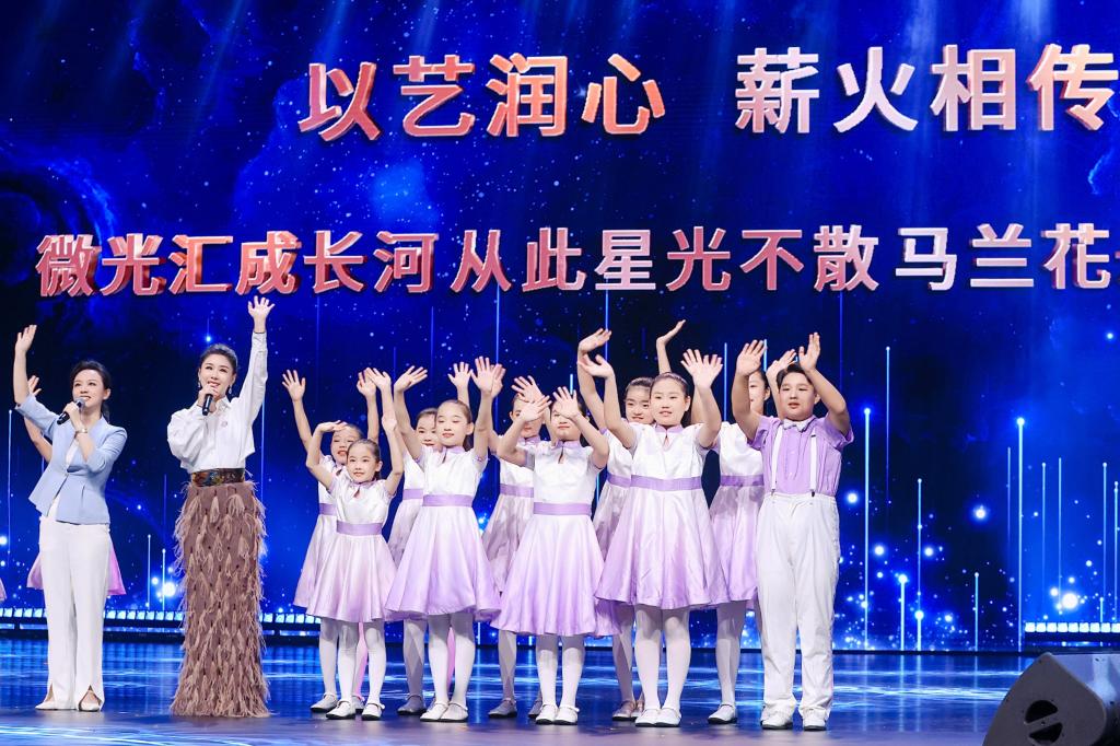 马孟楠(左一)在“时代风尚”文艺志愿者在行动特别节目中与演员李小萌、马兰花儿童声合唱团表演情景诗画《月亮舞台》