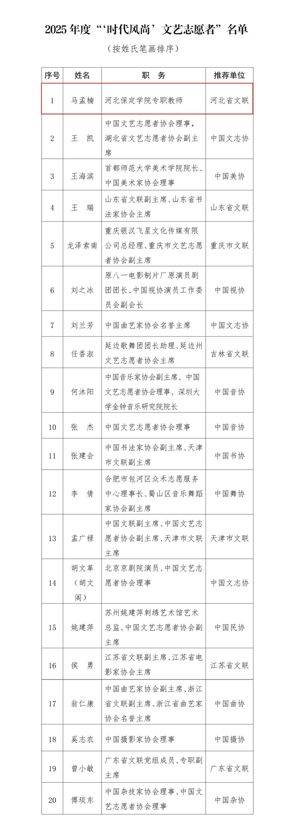 经中央宣传部批准,中国文联首次开展了2025年度“‘时代风尚’文艺志愿者”宣传选树活动。经中国文联各团体会员推荐、专家推选、社会公示等环节,全国共推选出2025年度“时代风尚”文艺志愿者20人,我校青年教师马孟楠光荣入选。