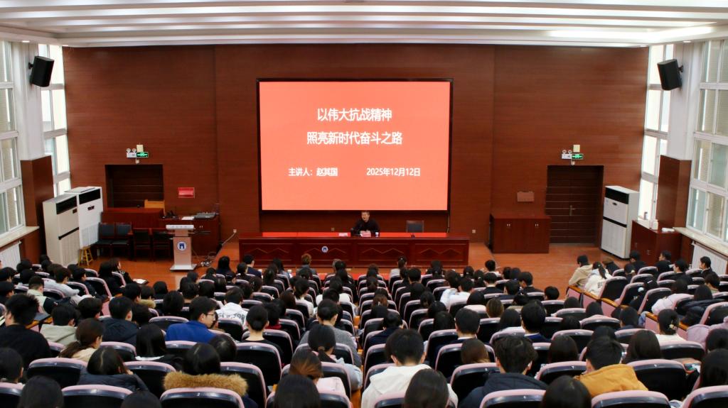 12月12日下午,党委常委、副校长赵其国在昌绪学术厅以《以伟大抗战精神照亮新时代奋斗之路》为题为地理与旅游学院、美术与设计学院的220余名学生讲授思政课。
