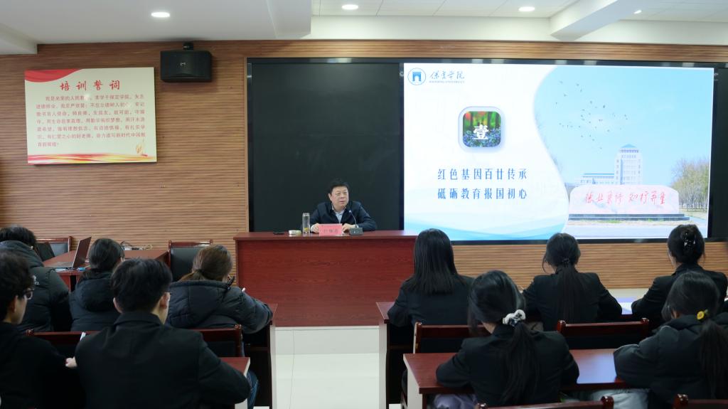 课上,孙胜存以丰富生动的资料事例,详细讲解学校120余年红色基因、文化基因、科学基因的历史传承,深入阐释西部支教群体奉献精神的时代价值。他深刻指出,保定学院西部支教群体是中国当代青年爱党报国、挺膺担当的榜样模范,也是保定学院百余年红色基因传承的时代缩影。孙胜存激励同学们,要铭记红色校史,传承红色基因,厚植爱国情怀,将个人价值同国家需要融合统一,把人生追求同人民福祉紧密相联,自信自强、刻苦求知、全面发展,在强国建设时代征程绽放保定学院学子灿烂的青春之花。