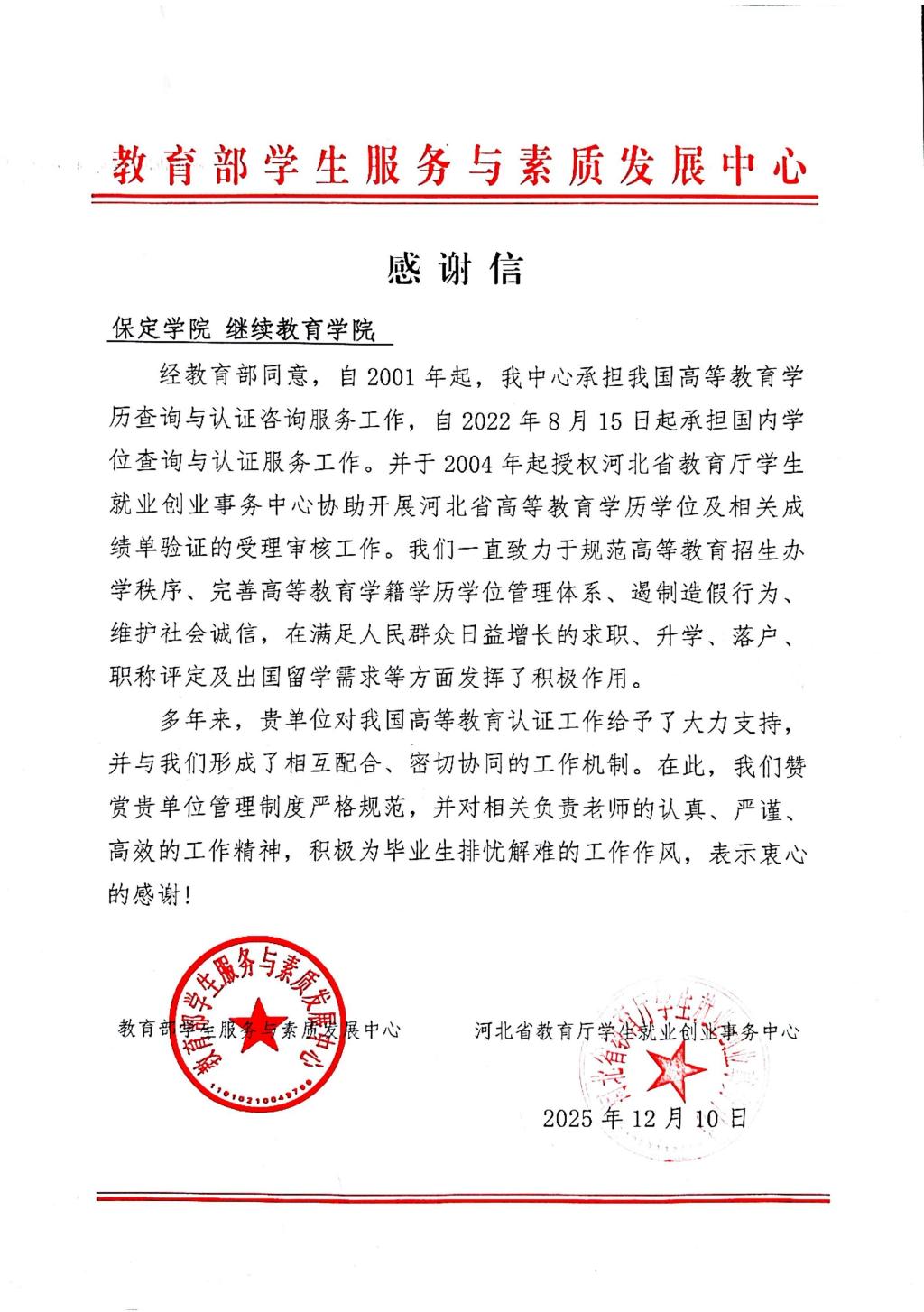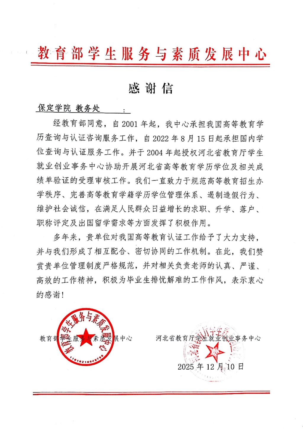 感谢信指出,多年来保定学院对我国高等教育认证工作给予了大力支持,与教育部学生服务与素质发展中心形成了相互配合、密切协同的工作机制。信中对我校严格规范的管理制度表示赞赏,对相关负责老师认真、严谨、高效的工作精神以及积极为毕业生排忧解难的工作作风表示衷心感谢。