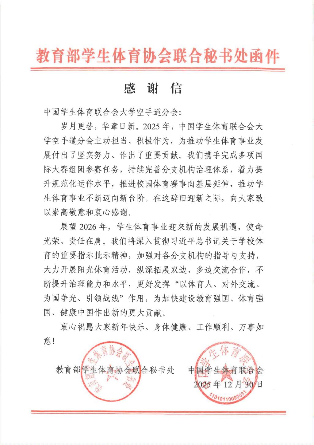 近日,教育部学生体育协会秘书处致信我校,对我校作为中国学生体育联合会大学空手道分会主席单位在2025年作出的工作成绩给予高度赞誉和衷心感谢。
