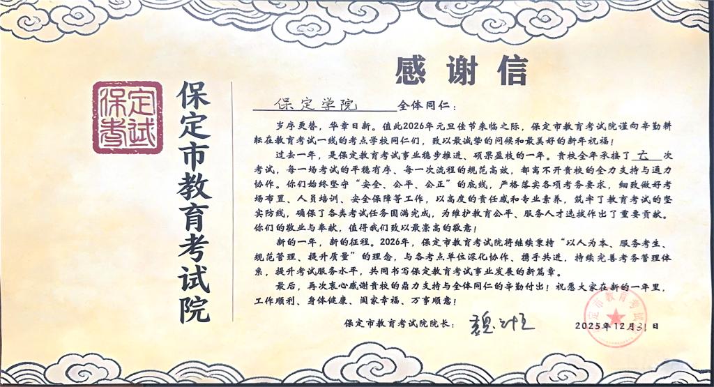 近日,保定市教育考试院发来感谢信,对我校2025年的教育考试工作给予高度肯定。信中强调,保定学院始终坚守安全、公平、公正的底线,严格落实各项考务要求,以高度的责任感和专业素养,确保了各类考试任务圆满完成,为维护教育公平、服务人才选拔作出了重要贡献。