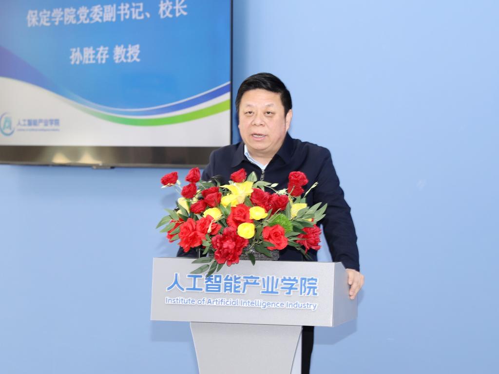 党委副书记、校长孙胜存教授,党委常委、副校长赵晓明教授,保定市教育局党组成员、副局长董群,中国信息通信研究院河北分院院长夏骆辉,保定市数字产业投资集团有限公司总经理王家琳,河北省信息产业与信息化协会产教融合专委会副秘书长康新忠,东软教育科技集团华北区总经理郭帅,保定市科学技术局、保定市数据局、天峋创新(河北)科技有限公司、精工自动化保定分公司、长城汽车股份有限公司有关领导,我校教务处、科研处、人工智能学院、信息工程学院负责同志和教师代表参加会议。