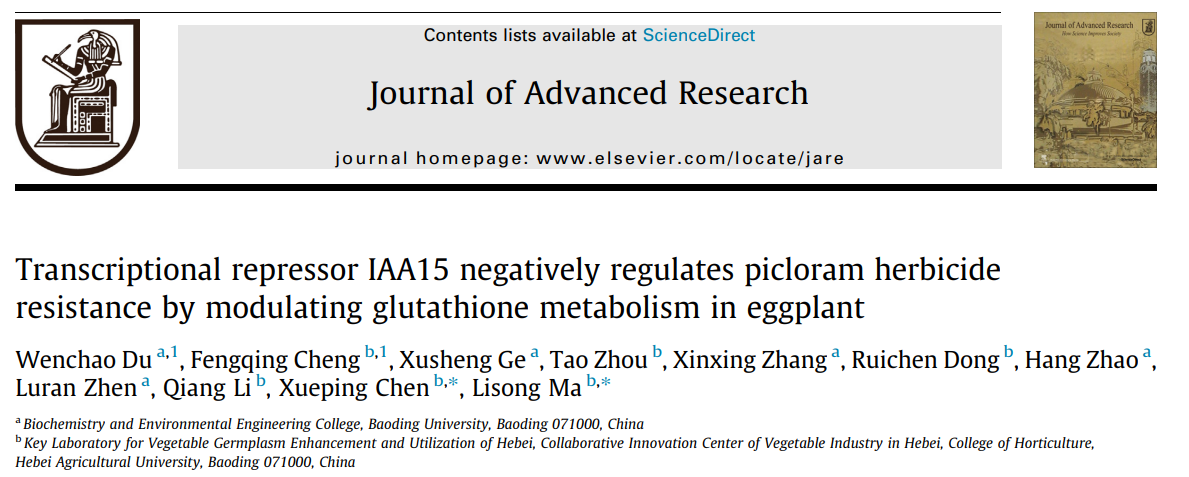 2月25日,我校生物化工与环境工程学院青年教师杜文超在国际顶级学术期刊《Journal of Advanced Research》(中科院综合学科一区top期刊,2025年IF=14.2)在线发表题为“Transcriptional repressor IAA15 negatively regulates picloram herbicide resistance by modulating glutathione metabolism in eggplant”的开拓性研究成果。我校为第一完成单位,河北农业大学为共同完成单位。该研究首次系统揭示了SmIAA15在调控茄子对生长素类除草剂毒莠定中的分子作用机制。这是杜文超博士继2025年12月在国际农林科学领域顶级期刊《LWT-Food Science and Technology》发表研究成果后,短期内再次取得的又一高水平研究成果。