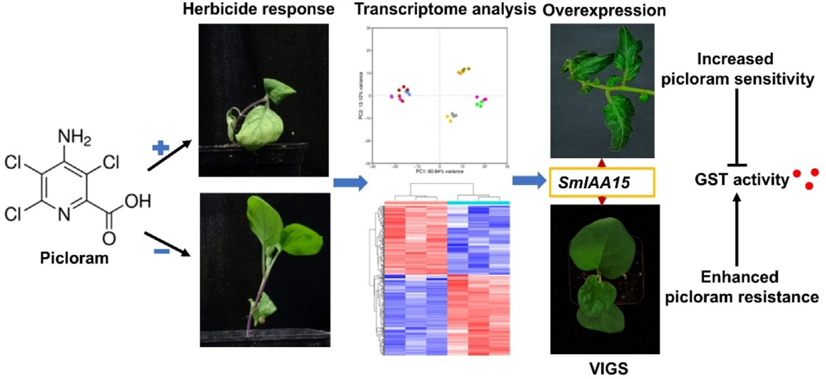 研究团队综合转录组学及生理指标分析,发现毒莠定处理显著提高IAA15的表达。进一步研究发现,SmIAA15瞬时过表达烟草在毒莠定处理下表现更严重的叶片卷曲度,该基因的瞬时沉默茄子植株能够增强对毒莠定的抗性。转录组学进一步分析沉默系茄子植株和对照发现,谷胱甘肽代谢通路发生明显变化,GST酶活升高。通过转基因技术获得的SmIAA15番茄植株,叶片有类似除草剂伤害的表型,同时在毒莠定诱导条件下叶片卷曲更为严重,GST酶活受到抑制。这一发现为进一步发掘茄子抗生长素类除草剂基因提供了科学依据。