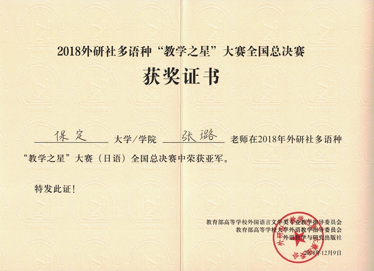 12月7日—9日,2018外研社多语种“教学之星”大赛全国总决赛在北京举行,我校外语教育与国际商务学院教师张璐荣获日语组亚军。