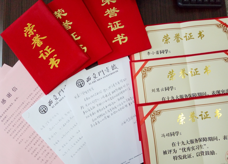 为协助北京西直门宾馆做好十九大召开期间三省代表团和驻地工作组的接待保障任务,我院选派了42名优秀青年志愿者赴京。经过严格的综合培训,志愿者们在安检、会客、财务、客房、餐饮等岗位上,为代表们提供了热情周到、耐心细致的优质服务,展现出了良好的专业素养和高度的组织纪律性,得到了代表与宾馆各级领导的一致好评。