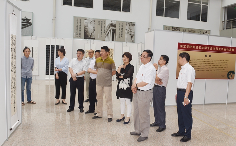 612上午,中文系首届书法专业毕业生作品展在图书馆一楼大厅开展。院领导王军、回顺利、高颖、徐景星及办公室、宣传部、教务处、学报负责同志兴致勃勃地参观了展览,并对展出作品给予充分肯定。
