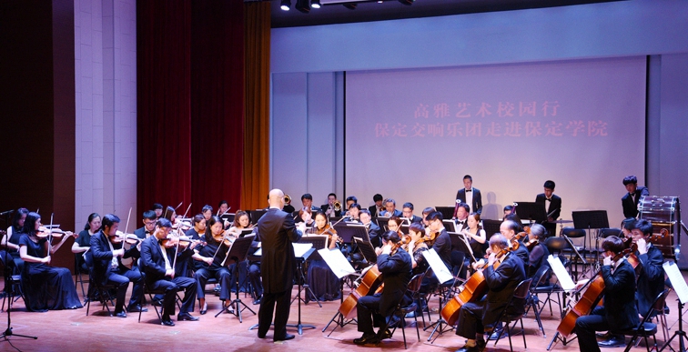 5月16日晚,“高雅艺术校园行”保定交响乐团专场演出在我院多功能厅隆重举行。团市委书记金培元,保定市文广新局副局长万进儒,莲池区党委副书记刘晓鹏,莲池区副区长张杰、杨卉青,直隶大剧院保定交响乐团董事长苏志勇,我院党委副书记宋书通出席活动,与700余名师生共同观看演出。