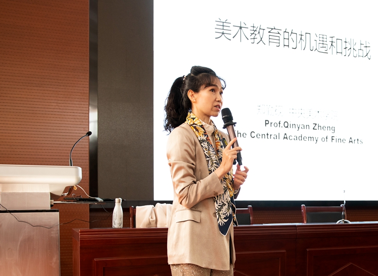 郑勤砚教授的讲座以“美育精神”开篇,她结合多年教学经验和国内外教育实例,从科技、脑科学、人工智能等方面深入剖析了当今社会构建平衡的美术课程的重要性和未来美术教育的发展方向。郑勤砚教授用生动温暖、引人入胜的讲述,为现场观众上了一堂充满魅力的艺术教育课。