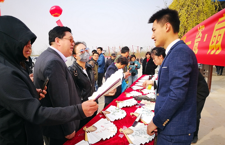 4月8日,博野县2019乡村生态游启动仪式在沙窝村千年古梨园广场举行,万亩梨花竞相绽放,吸引了众多游客赏花踏青。今年的博野乡村生态游活动,我校美术与设计学院应邀参与其中,不仅为活动设计制作了“梨花节”系列标识、邀请函、吉祥物、表情包等,而且为沙窝村进行了主题墙体彩绘,在古梨园开展艺术品展览、写生创作等。其中,师生们结合博野县文化底蕴和千年古梨园的特色设计制作的“瓷·扇·梨花颂”主题艺术品,突出地域特色,富有文化气息,在生态游开幕当天的义卖活动中一经展出便得到了广大游客的喜爱,提升了活动影响力和美誉度。随后,美术与设计学院负责同志将义卖所得款项全部捐赠给了沙窝村的贫困家庭。