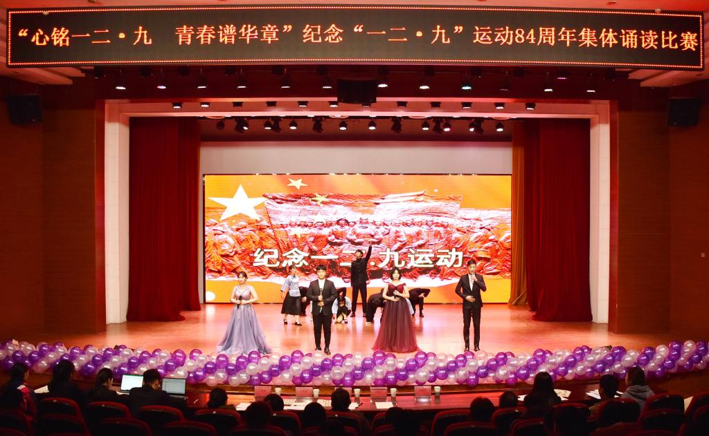 为传承弘扬“一二·九”运动的爱国精神,引导广大青年坚定理想信念,涵养家国情怀,建功新时代,12月9日,由校团委主办、校学生会承办的“心铭一二·九 青春谱华章”纪念“一二·九”运动84周年集体诵读比赛在畿辅文化会堂隆重举行。