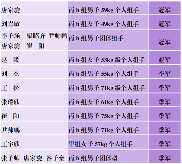 成绩的背后,是不为人知的付出。每块奖牌都记录着许多被汗水浸湿的故事。2021级休闲体育专业的唐家旋深知,荣誉要靠信念和实力去争取。他一鼓作气旋风般拿到了丙b组59kg个人组手冠军、丙b组男子团体组手冠军和丙b组男子团体型季军三个奖项。“竞技体育精神就是要在比赛中拼尽全力,拼,就无悔。那些曾经流过的泪水、汗水和受过的伤都值了。”唐家旋感受到了竞技体育带给自己的成长。