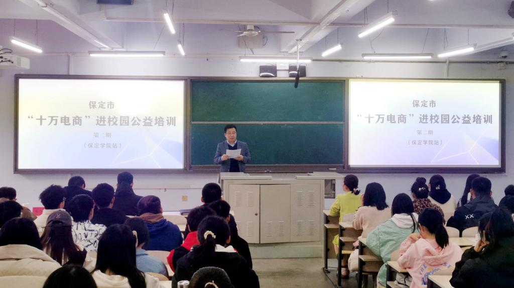 按照市委、市政府统一部署和保定市商务局、保定市教育局的具体安排,11月8日,保定市“十万电商”进校园公益培训第二期活动在我校举行。活动以线上线下相结合的方式开展,保定市商务局、保定市教育局、我校创新创业教育中心负责同志和近200名学生代表在我校综合楼会场参会,2100余名学生通过观看线上直播参加培训。