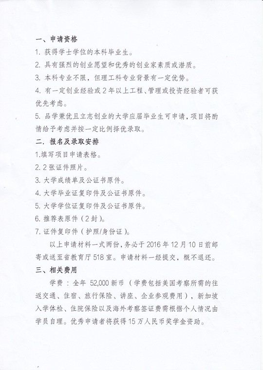 2001年1月该校创建了南洋科技创业中心,以大力推动和发展科技创业教育。经过10年在创业与创新教育领域的高度专注和精心打造,积累了丰富的研究经验和教学资源,成功打造了全球独树一帜的创业教育精品项目–创业与创新硕士学位课程。该中心推崇团结协作、共同发展。众多海内外杰出的创业家、企业总裁、风险投资人、知识产权律师和知名创业学者都曾应邀给创业学员讲学授课。学员们不仅能系统学习创业理论,还有机会与全球学术界和企业界领袖进行互动交流,从而快速提升创业技能和广泛拓展创业网络。学习期间将安排学员赴美国进行考察和参观。该课程中文授课,学制一年,通过我省选拔并经南洋理工大学审核通过的学员将于2017年7月赴新加坡学习。