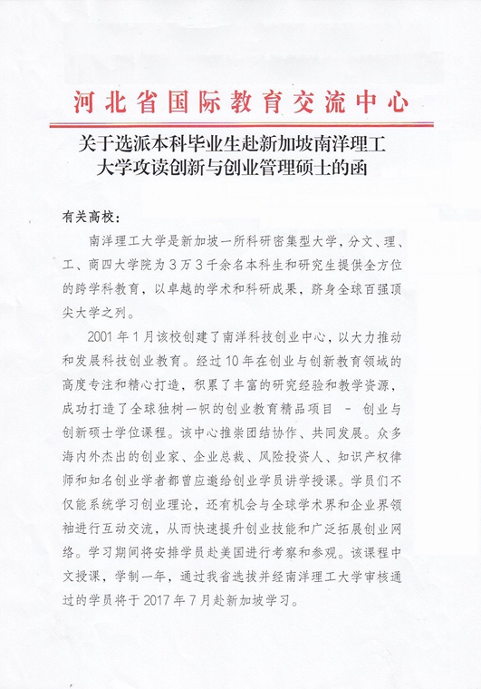 根据省教育厅国际教育交流中心《关于选派本科毕业生赴新加坡南洋理工大学攻读创新与创业管理硕士的函》,2017年赴新加坡南洋理工大学攻读创新与创业管理硕士项目的申报工作已开始。现将此通知转发给你们,请认真组织符合条件的人员报名。