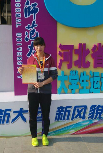 管理系2012级经济管理专业学生。中共预备党员。连续两次荣获国家励志奖学金。担任系学生会体育部部长,组织带领本系同学参加学院举办的阳光长跑、篮球赛、排球赛、运动会等多项活动。连续两年代表学院参加河北省大学生运动会,所在团队获得河北省第18届大学生运动会甲组女子篮球赛第六名,获得2014年甲组田径比赛100米第二名、200米第三名的好成绩,打破学院200米记录。积极参加三届校运会,均获100米第一名、200米第一名。参加学院篮球赛、排球赛、阳光长跑等,均取得了良好成绩。