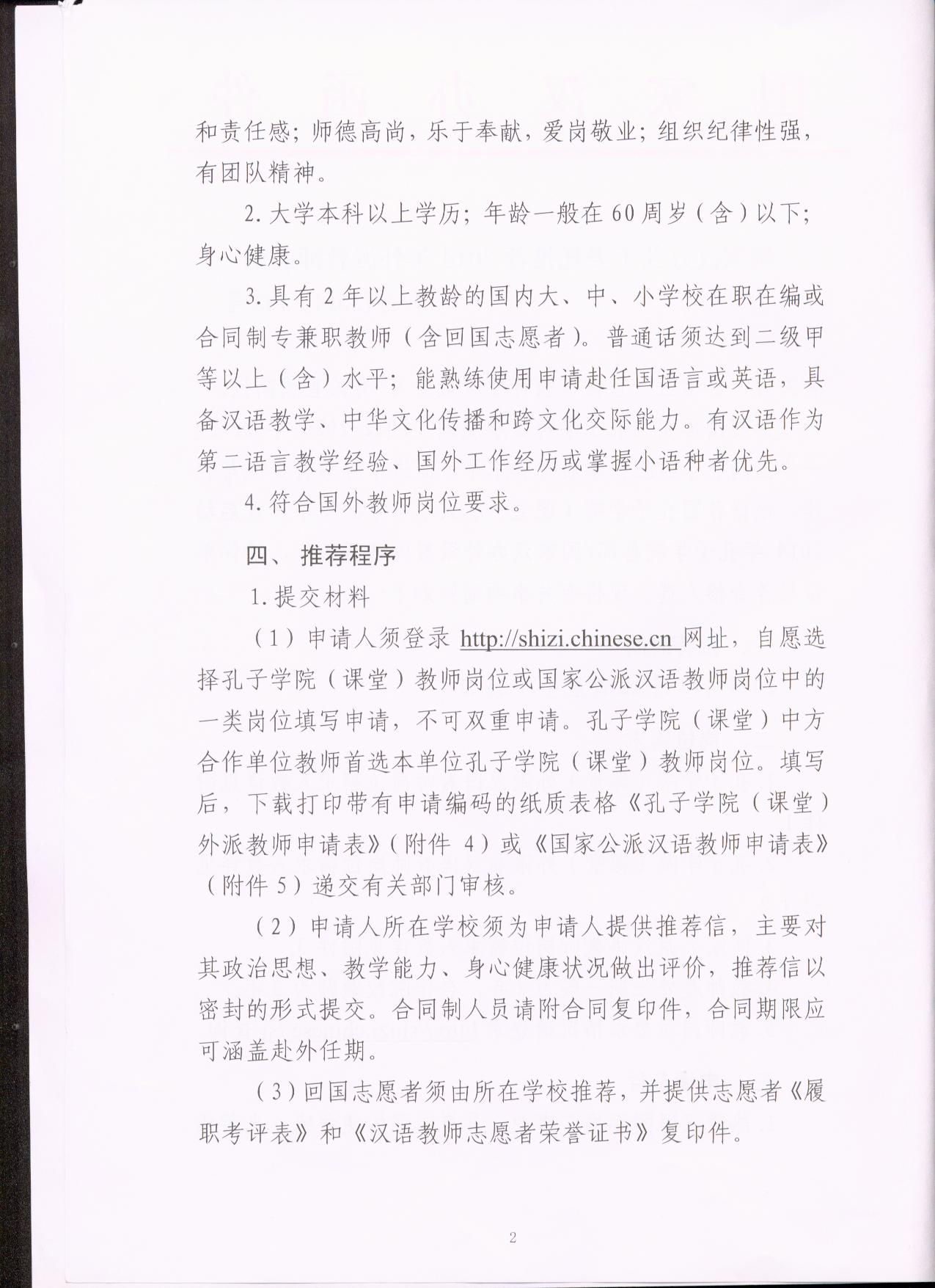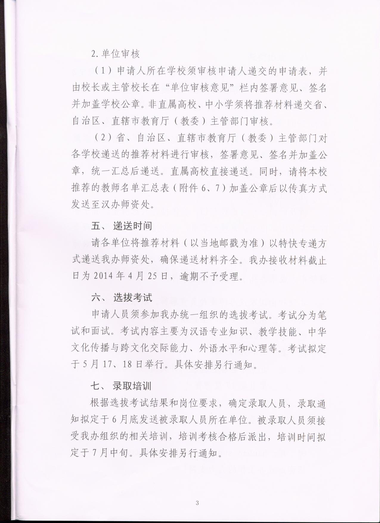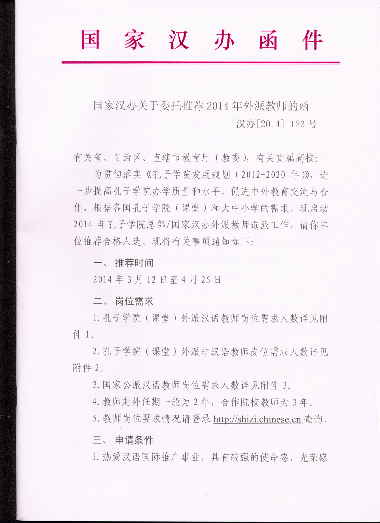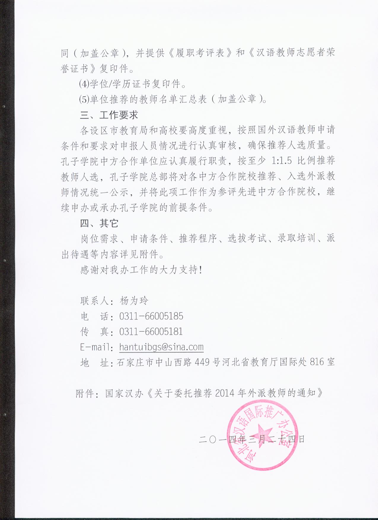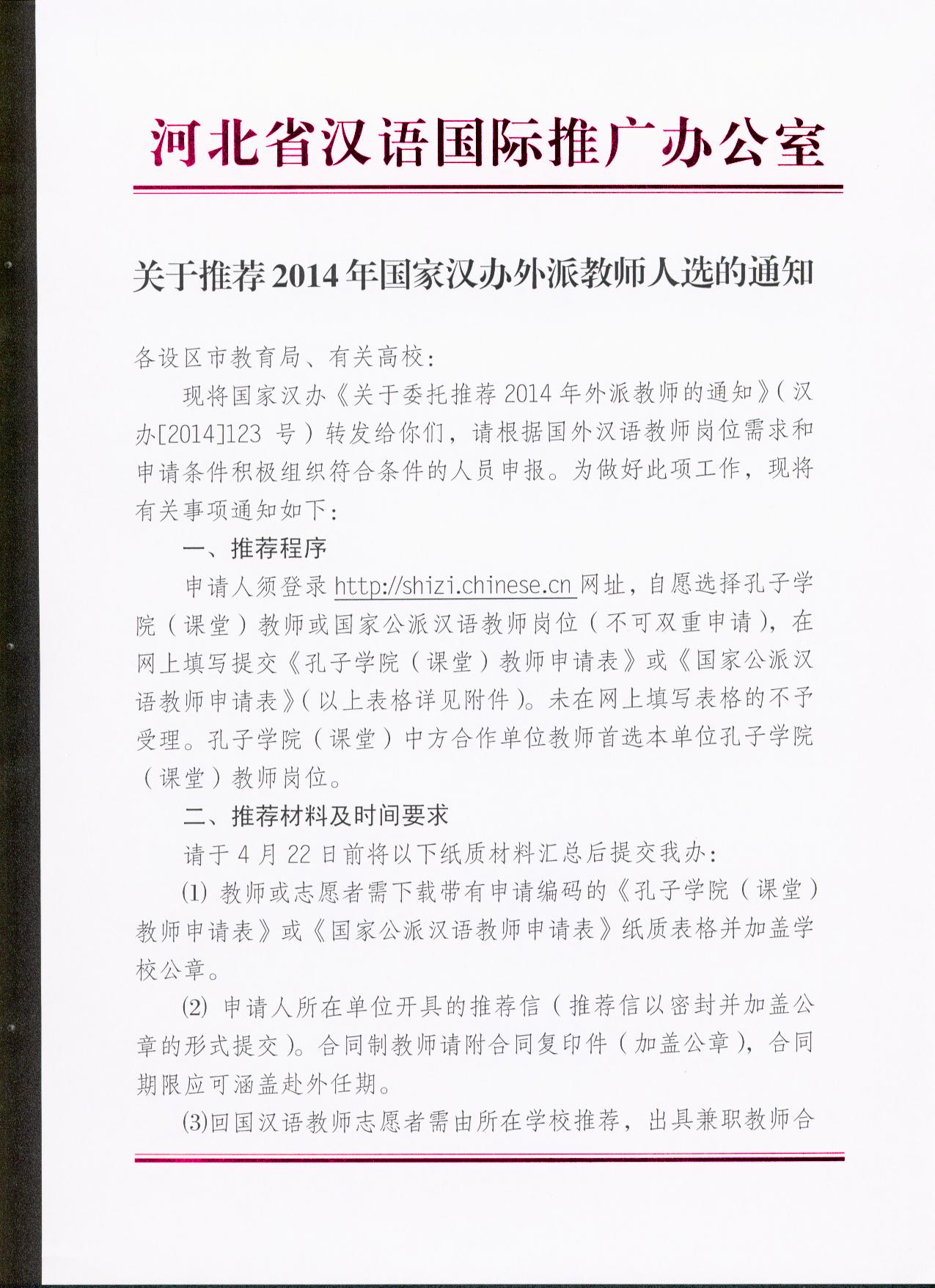 根据省教育厅河北省汉语国际推广办公室《关于推荐2014年国家汉办外派教师人选的通知》,目前2014年国家汉办外派教师人选的报名工作已经开始,有关岗位需求、申请条件、推荐程序等内容详见办公系统相关公告,请严格按照文件要求抓紧时间通知所有符合条件的人员,认真组织好此次预报名工作。