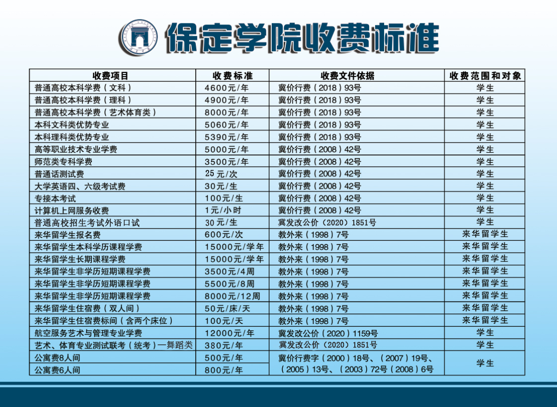 根据《河北省发展和改革委员会河北省财政厅关于制定河北省普通高考报名考试费标准的通知》(冀发改公价(2020)1851号,我校相关收费标准变动,普通高校招生考试外语口试考试费标准为每人30元,普通高考艺术、体育专业测试联考(统考)考试费标准为:音乐类、舞蹈类380元/人,特此公示。