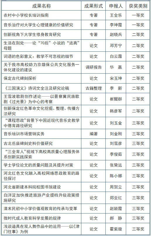 日前,第十四届保定市社会科学优秀成果奖获奖名单公布,我校21项成果获奖。其中,王全乐的专著《农村中小学校长培训指南》、李坤霞的专著《音乐治疗对大学生心理健康的价值研究》荣获一等奖。